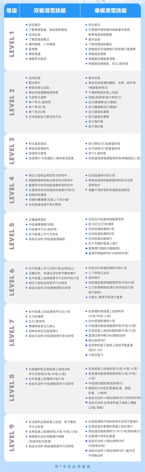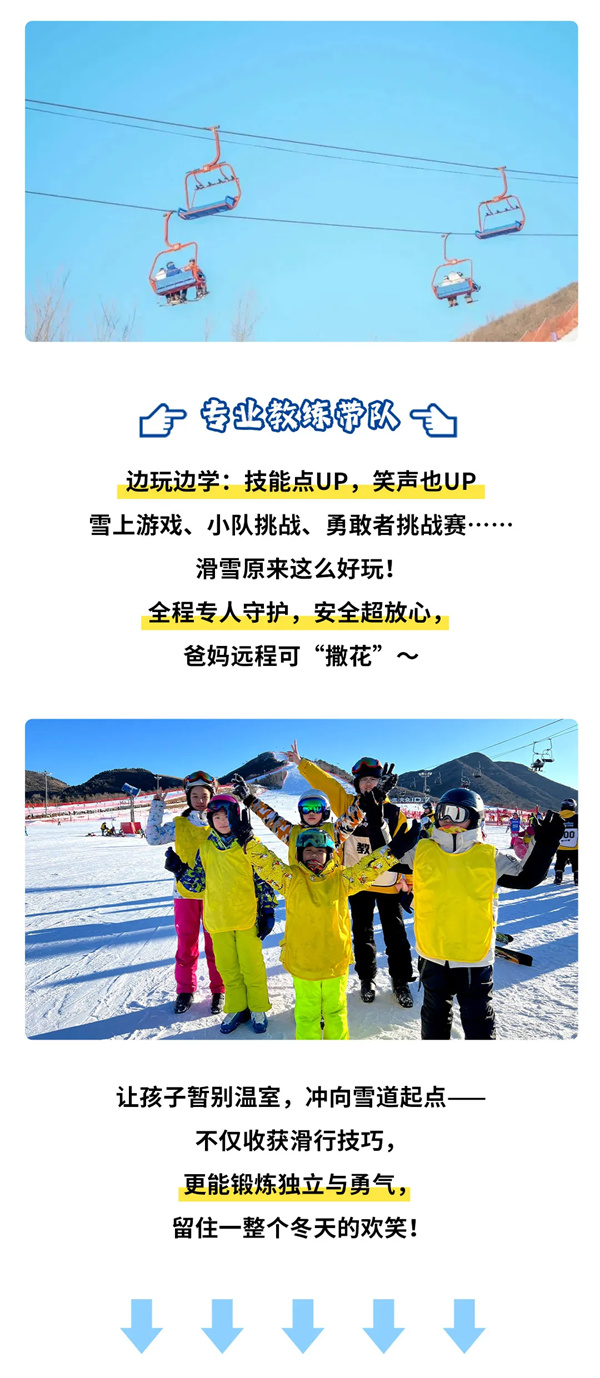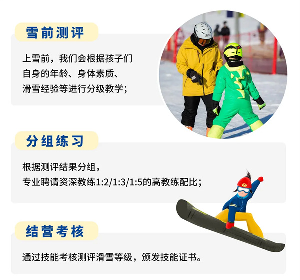 教学师资:双板教练采用1:5配比、单板教练采用1:3配比,小班化教学让教练能实时关注每个孩子的动作规范与安全状态;