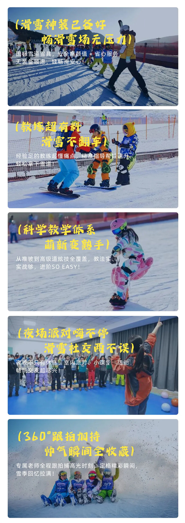 进口造雪设备+全套儿童专业安全雪具,专属雪道1条、专属雪具大厅、专属绿色通道,带给孩子更安全、舒适的硬件基础;