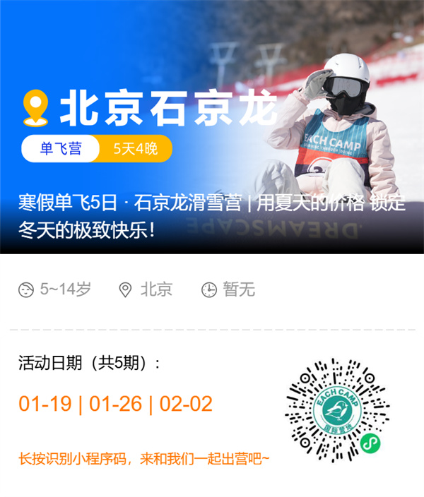 EACH CAMP石京龙滑雪营以5年的运营经验和卓越的口碑成为了家长们的首选。我们不仅仅是教授滑雪技巧,更是在培养孩子对冰雪运动的热爱。我们相信,每个孩子都能在滑雪中找到乐趣!