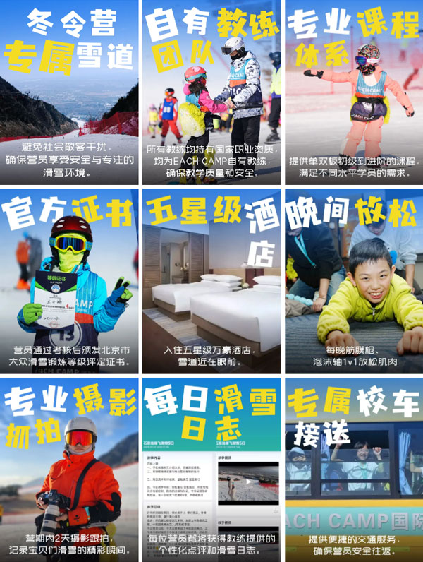 滑雪的第一重要因素永远都是安全!安全!安全!但是每到冬季雪场往往人满为患,这样的环境完全不利于初学者学习滑雪。EACH CAMP在石京龙滑雪场为冬令营学员设置专属雪道教学区,与散客隔绝,将私密性和安全性做到最好,减少冲撞风险!