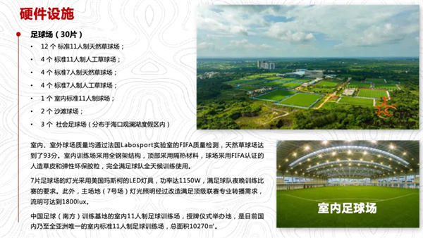 中国足球(南方)训练基地共有30个足球场室内、室外球场质量均通过FIFA质量检测,天然草球场达到了93分。室内训练场采用全钢架结构,顶部采用隔热材料,完全满足球队全天候训练使用。