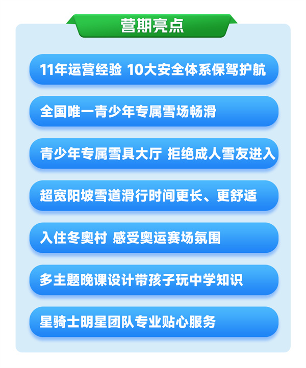 营期内为孩子们准备了专属雪道、专属训练区、专属活动室、专属用餐区、专属住宿区、专属休息室、专属晚课教室、专属雪板存放区,让孩子们舒适畅滑!