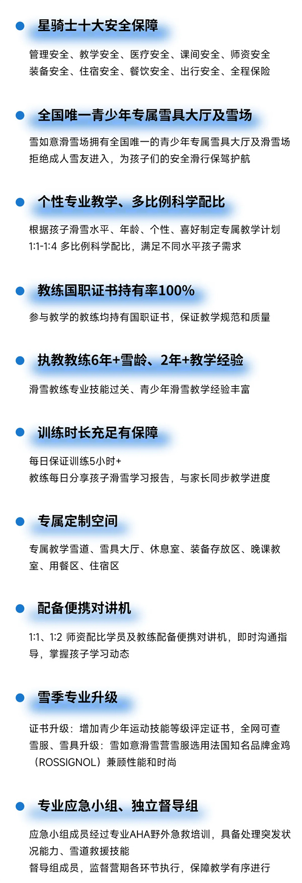 · 教练教学采取科学四步教学流程,确保孩子们能够理解并扎实学习(每天上雪时间不低于5小时)。