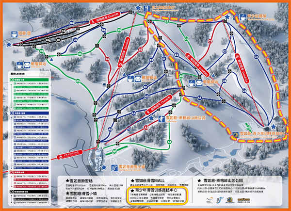 雪如意滑雪场雪道全览(右侧为青少年专属滑雪雪道)