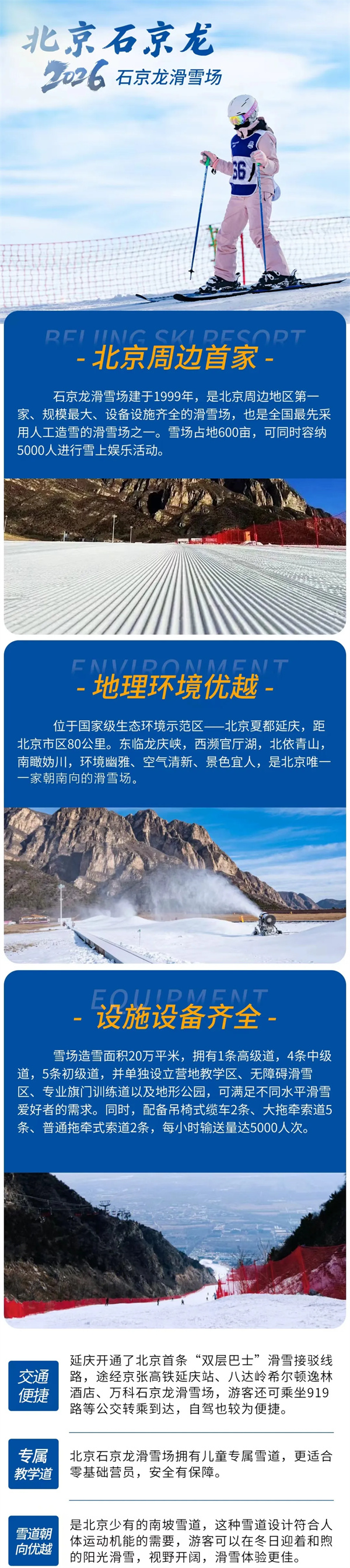 优质专业:五星品质,国际装备【踏雪寻春】2026年滑雪学院第四站位于北京石京龙。是北京周边地区第一家,规模最大、设备设施齐全的滑雪场,也是全国最先采用人工造雪的滑雪场之一,雪场占地600亩,可同时容纳5000人进行雪上娱乐活动。