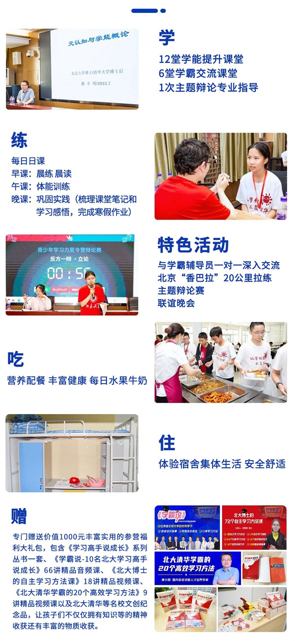 02名校名师权威保障|由北大等知名高校领衔的名校导师、学习力提升专家、心理导师、学霸导师、营地导师等组成的强大导师团队授课辅导,深度的互动交流,全方位的保障关注每一个营员的收获与成长。