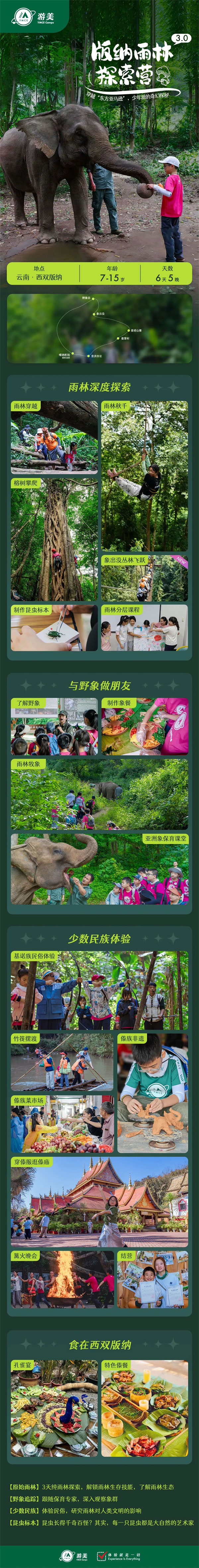 我们将短暂与世界失联,沉浸于基诺山原始雨林的怀抱;深入追踪亚洲象群,与这些温柔的巨人建立不解之缘;进去曼掌傣寨,体验千年傣文化传承和《向往的生活》里难得的宁静与质朴;制作昆虫标本,细微之处见生命奥秘......用体验式的学习方法激发孩子们对大自然的无限好奇与热爱,更着力培养他们的动手实践能力与户外生存技能,让每一次探索都成为成长路上宝贵的财富!