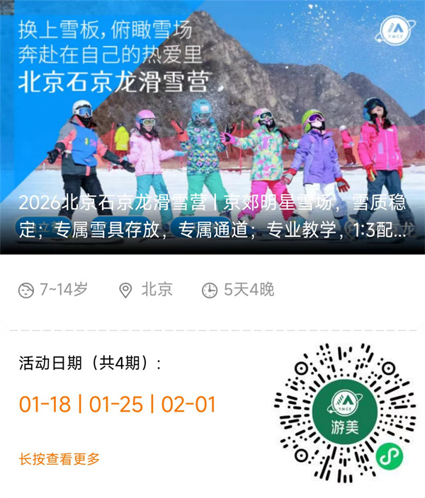 雪道坡度平缓,配套全天候教练团队,针对低龄学员设有安全防护课程,真正实现“滑雪小白技能飞跃”。1.5小时直达雪场,非常适合参加冬令营的青少年。