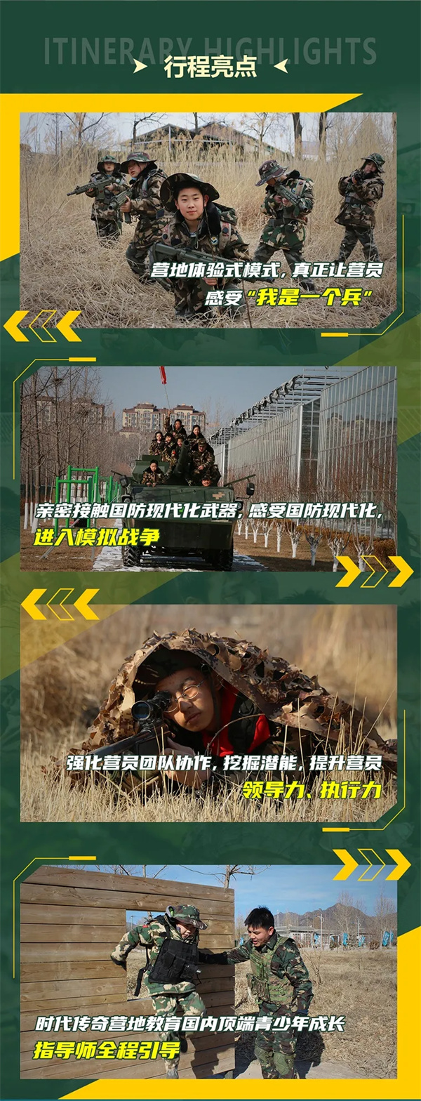 国内冬夏令营以“军事”为主题的“主题营”模式开拓者,并是国内军事主题营NO.1领军者,中国少年预备役训练营16年来零事故零投诉。我们的每个训练课程均带有主题指向,目的是使参加冬夏令营的营员在体验中成长。