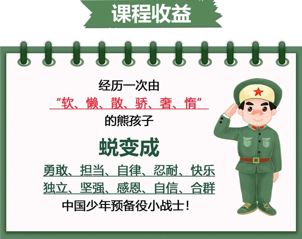 ★军事训练+行为习惯训练:通过军事化的行为训练,由外向内渗透,彻底解决内心不良根源,达到身心合一,想到可以做到,从而达到自律;