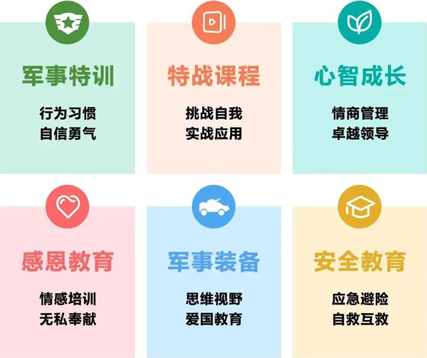 ★军事训练+行为习惯训练:通过军事化的行为训练,由外向内渗透,彻底解决内心不良根源,达到身心合一,想到可以做到,从而达到自律;